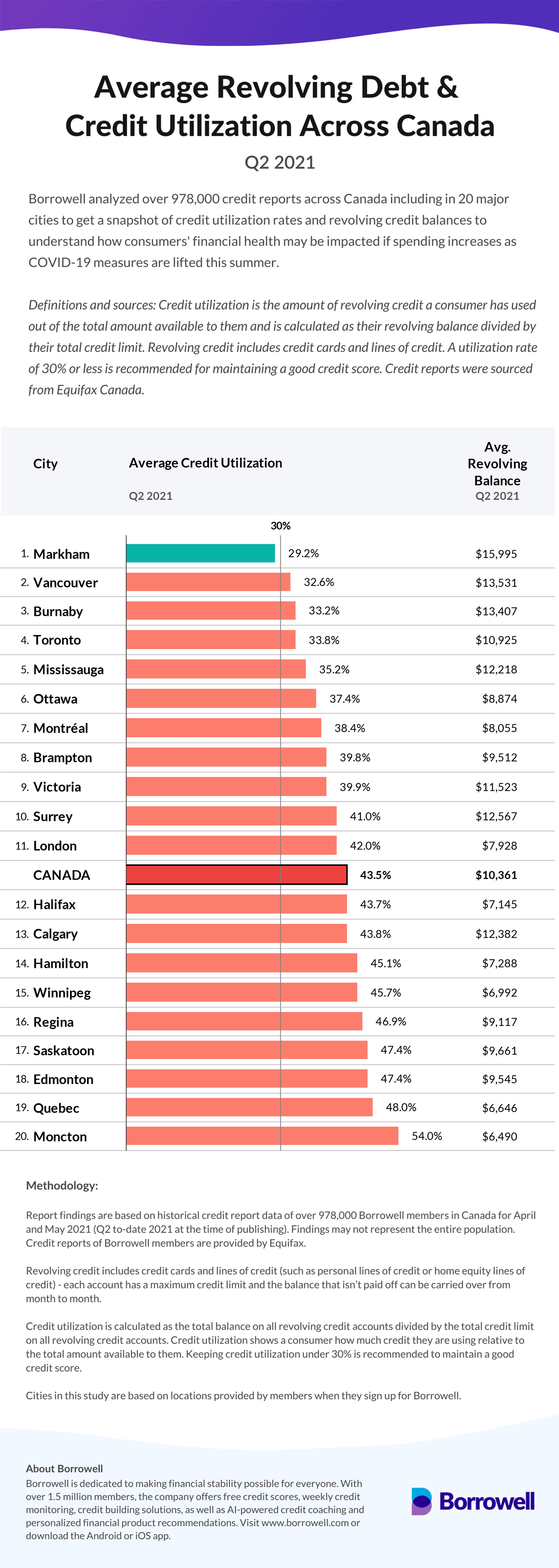 To get a snapshot of credit utilization rates and revolving credit balances across Canada, Borrowell, a fintech company that offers free credit report monitoring, analyzed over 978,000 credit reports of its members, including those in 20 major cities across Canada for Q2 2021 to-date (April and May 2021). The goal of this study is to help consumers understand how additional spending on credit cards and lines of credit as the country opens up may impact their credit scores and thus hinder future goals that require getting lending products, such as buying a home or other large purchases.