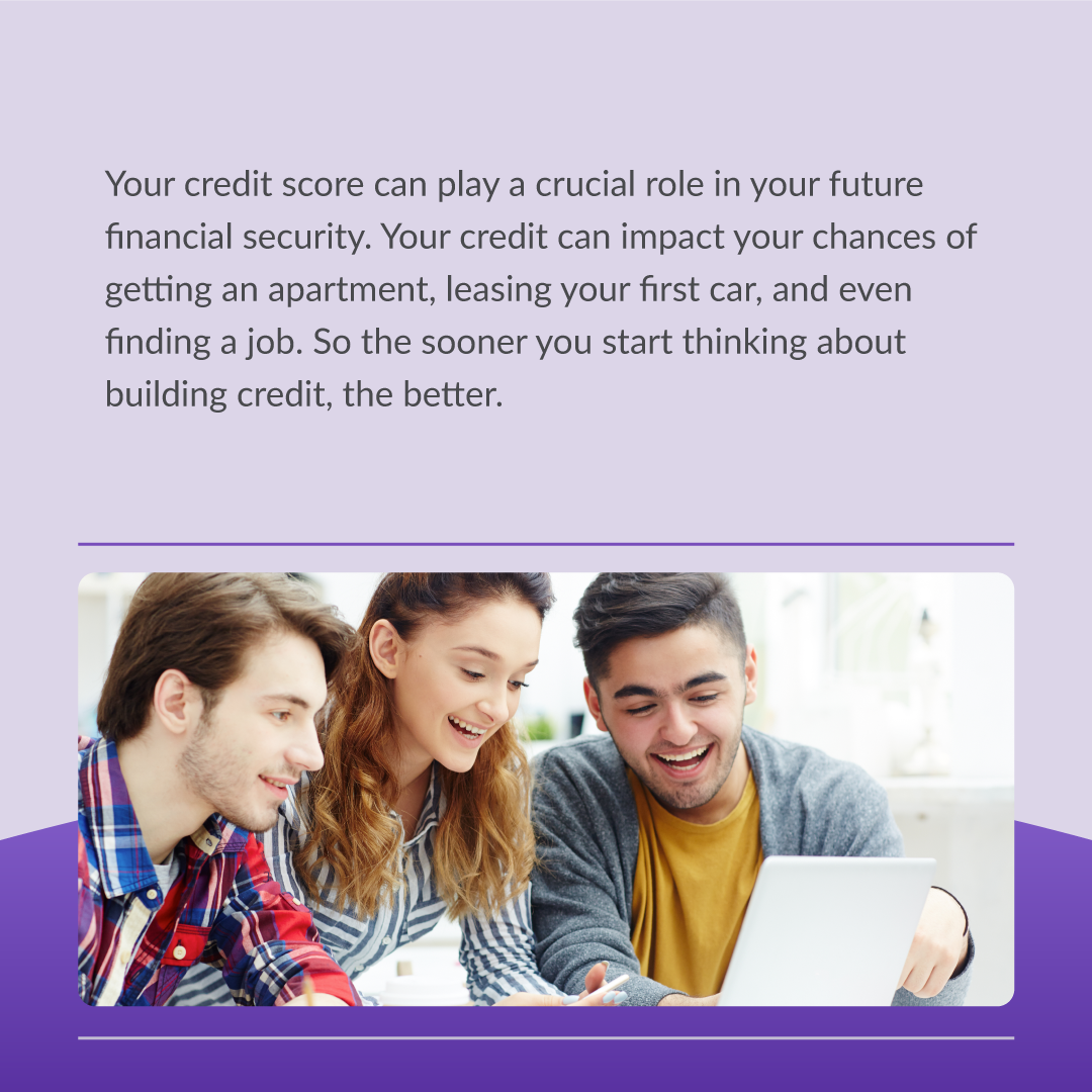 Your credit score can play a crucial role in your future financial security. Your credit can impact your chances of finding a job, getting an apartment and even leasing your first car. So, the sooner you start thinking about building credit, the better.